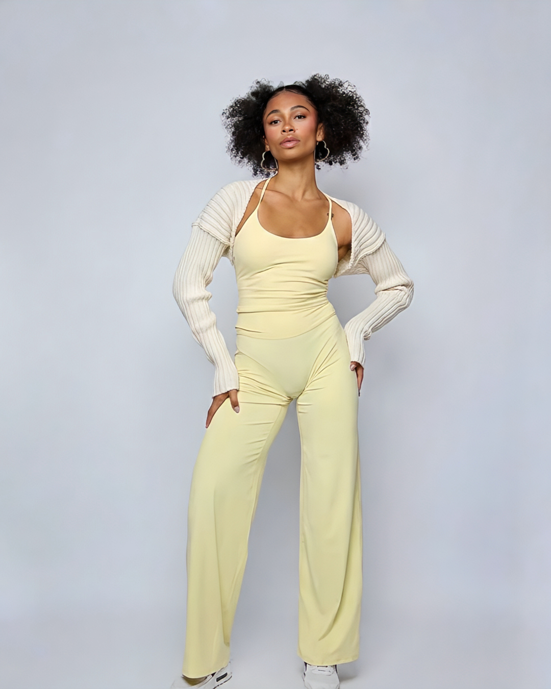 El top tiene tirantes delgados, ofreciendo soporte ligero y un diseño femenino. Los leggings campana de cintura alta estilizan la figura y permiten libertad total de movimiento.
