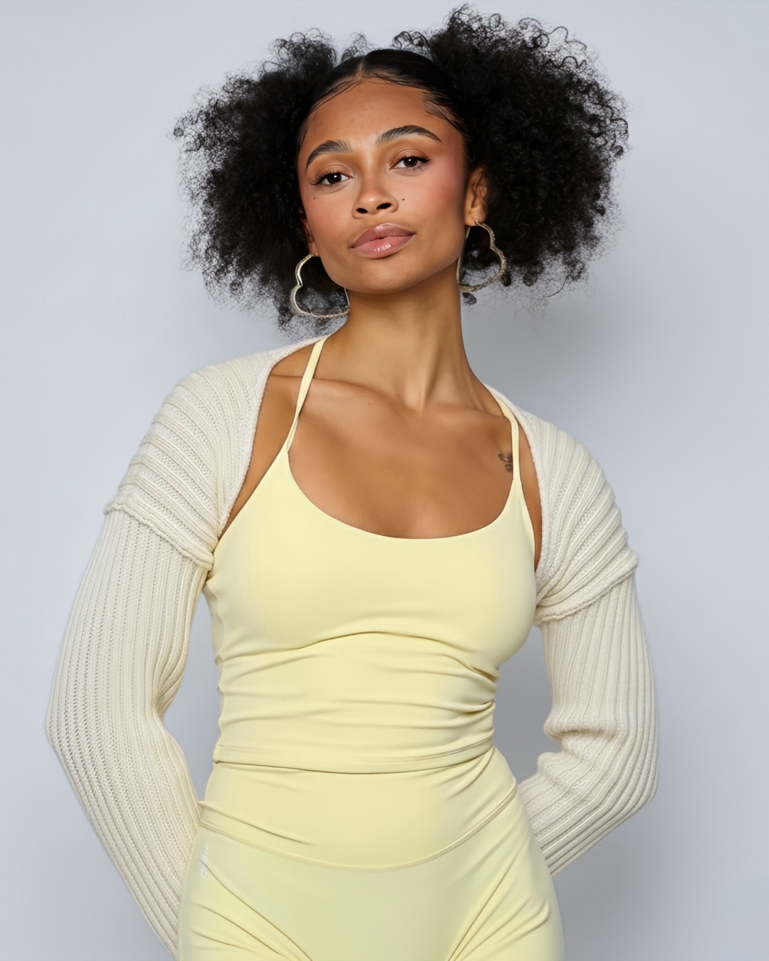 El complemento perfecto para tus outfits deportivos. Su tejido suave y ligero aporta abrigo sin perder libertad de movimiento, ideal para llevar antes o después de entrenar. Su silueta delicada y mangas largas le dan ese toque femenino y coquette que eleva cualquier look fitness con estilo y comodidad.