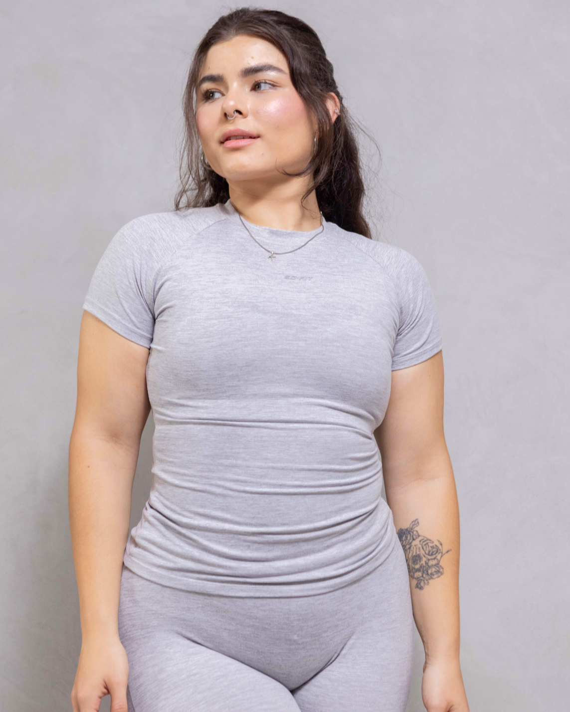 El material es transpirable, de secado rápido y resistente al uso diario, asegurando frescura y confort en todo momento. Disponible en color gris jaspeado, un básico atemporal que combina fácilmente con cualquier prenda o calzado.