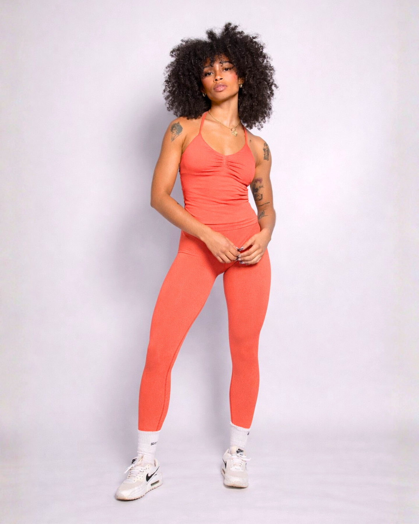 El top tiene tirantes delgados, ofreciendo soporte ligero y un diseño femenino. Los leggings tubo de cintura alta estilizan la figura y permiten libertad total de movimiento.